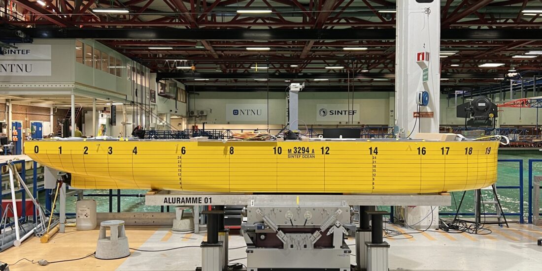 Men, før det uvanlig store fraktskipet kan bygges, skal SINTEF i Trondheim teste hvordan skipet tåler forskjellige bølgehøyder og bølgeretninger, og hvordan propellen oppfører seg i samspill med skroget.