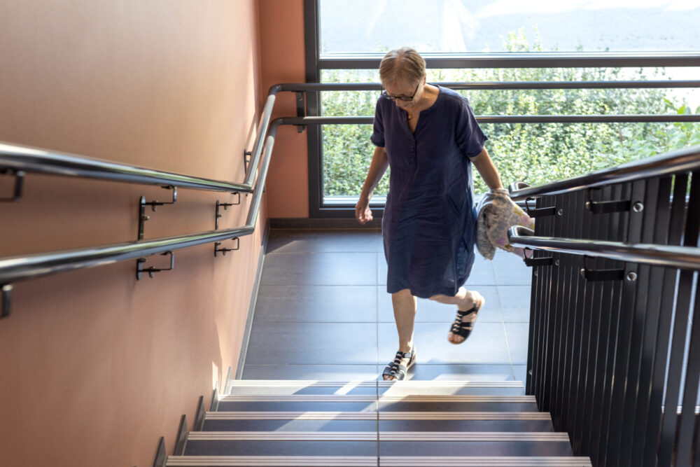 Trening i trapp. Ragnhild Langli bor i fjerde etasje i en blokk på Lade i Trondheim, og bruker trappa inne for å trene seg opp. – Først klarte jeg bare en etasje, men nå klarer jeg flere etasjer, sier Langli. Foto: Geir Mogen