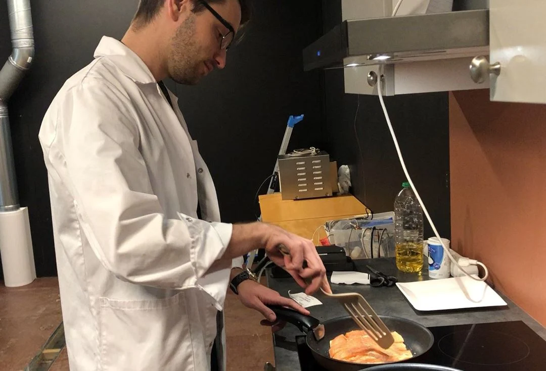 Her testes ulike ventilasjonsløsninger i SINTEFs laboratorium. Forskerne tilberedte 72 laksemiddager og overvåket inneklimaet. Her er Wojciech Wojnowski ved UiO i aksjon. Foto: Ida Rambæk/SINTEF