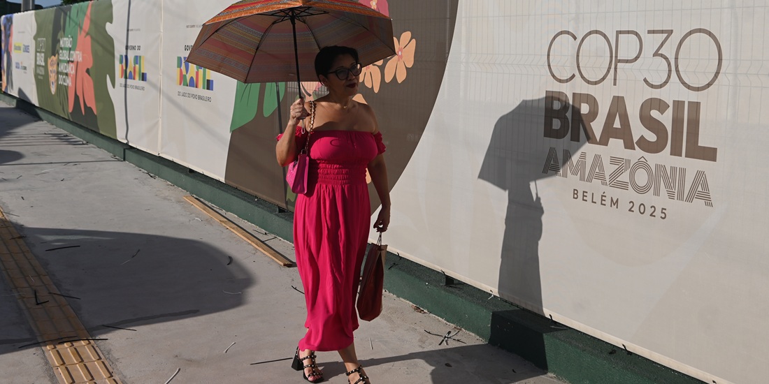COP30. Bildet viser en kvinne som går forbi et banner med reklame for COP30.