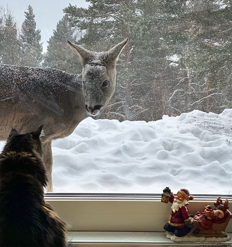 Rådyr kan dukke opp på fuglemateplassen for å sjekke om det er noen godsaker der. Pus følger nysgjerrig med på besøket. Foto: Nina Tveter, NTNU