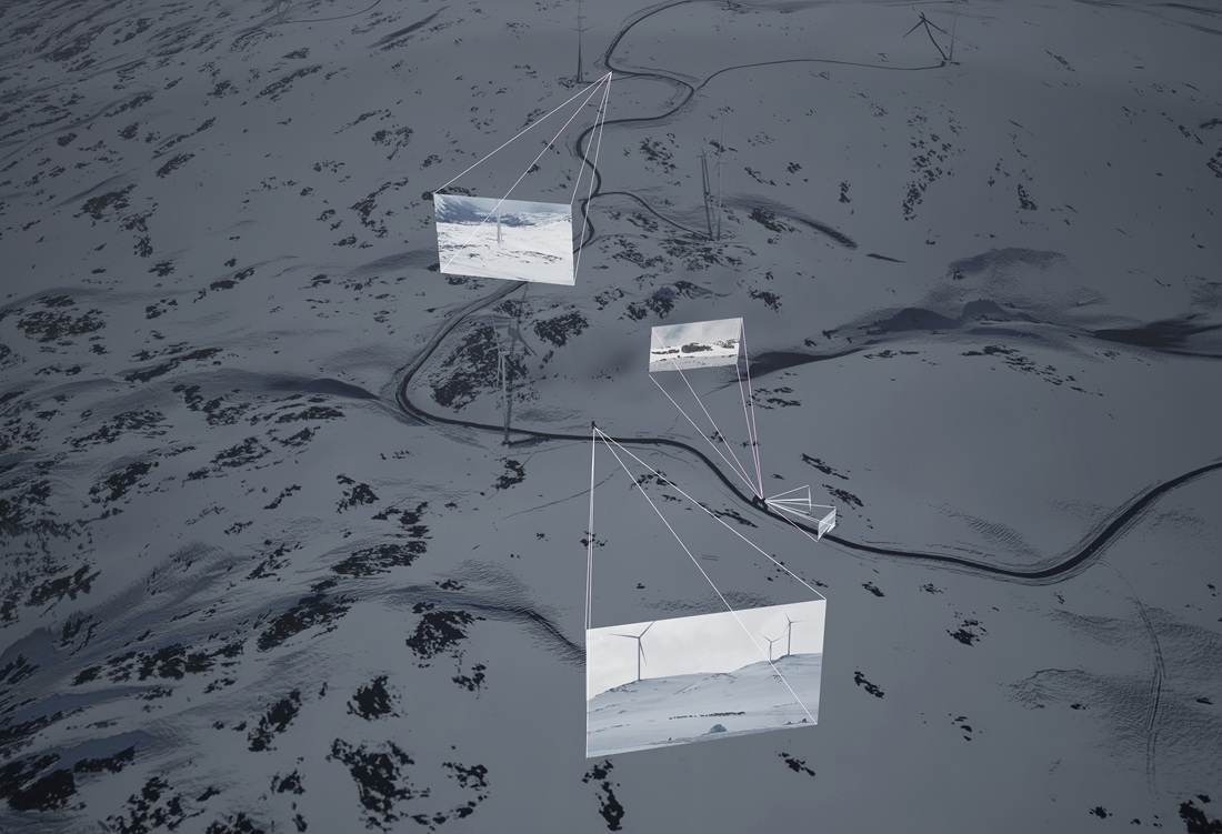 3D-rekonstruksjon av reinens vårmigrasjon gjennom vindkraftanlegget. Produsert for å støtte Jillen-Njaarke reinbeitedistrikt i deres rettssak mot Øyfjellet Wind AS. Illustrasjon: INTERPRT, 2024