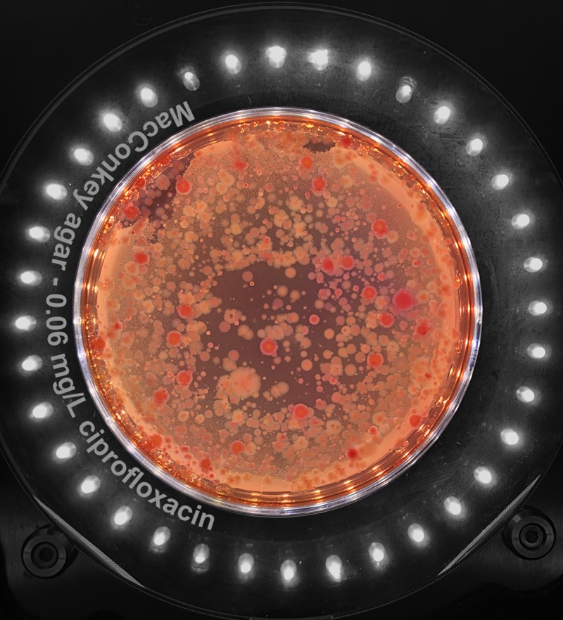 Livlige røde kolonier på MacConkey-agar: Evnen til å vokse her viser at bakteriene er motstandsdyktige. Fargen og veksten hjelper mikrobiologer med å identifisere vanlige tarmbakterier og teste resistensen deres. Foto: Thorben O. Reiche, NTNU/SINTEF