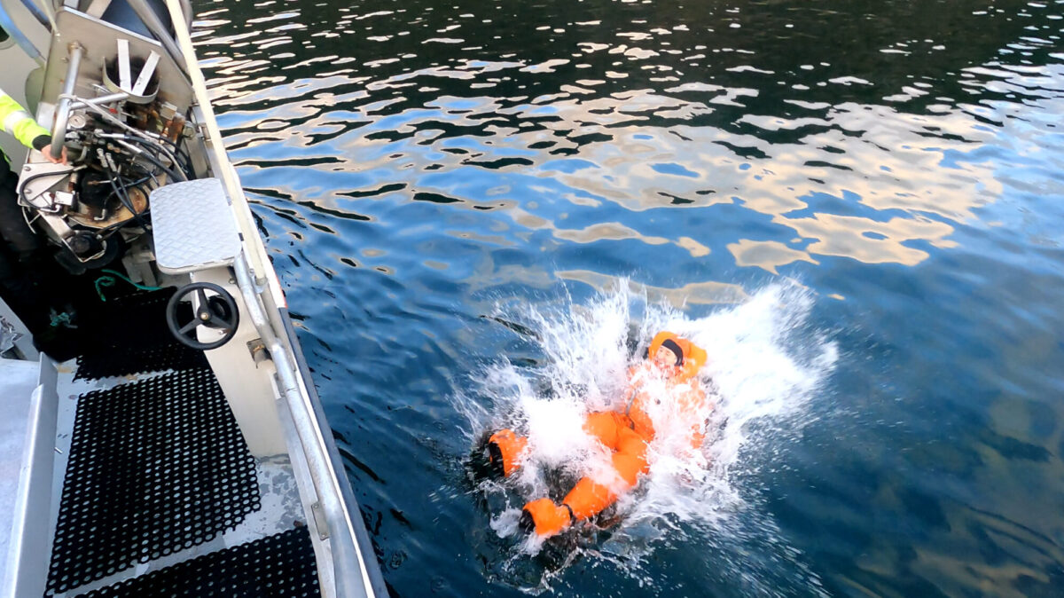 Men håpet er ikke ute: Et armbånd du har på deg registrerer fallet, stopper båten og setter i gang varsling, lysblink og lydsignal. Du vet derfor at redningsmannskapene og nærliggende fartøy har fått beskjed og at hjelpen snart er på vei.