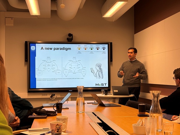 13 doktorgradsstudenter fra ulike institutter er knyttet til prosjektet Mobilitetslab Stor-Trondheim. Forskningen skal bidra med ny kunnskap knyttet til digitale teknologier og modeller, aktørers behov for mobilitet og nye transportmodelleringsmetoder. Her ser vi stipendiat ved ved Institutt for bygg og miljøteknikk Aashish Adhikari presentere sitt arbeid. Foto: Einar Brandser Olsson, NTNU