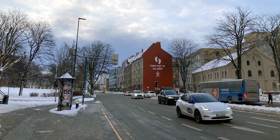 Høyt oppe på en naken gavlvegg er det malt to store fotavtrykk. «Takk for at du går» er det skrevet under.