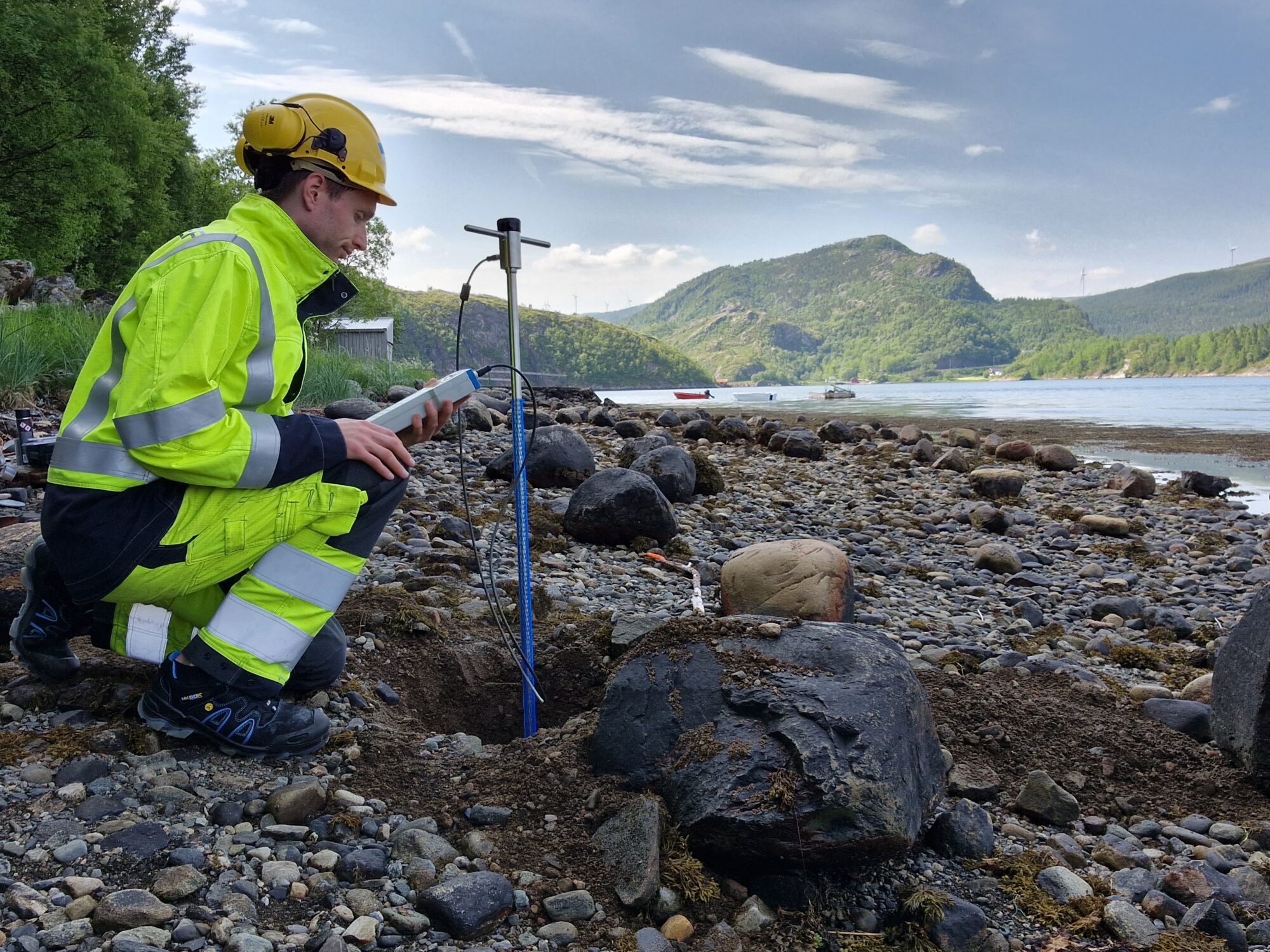 Det trampes i sand og grus på befaring. Ledningsevne i sanda måles. Det gjettes – hvor mye bedre holdes temperaturen nede med mer finkornet sand?