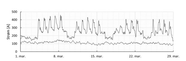 Kunnskap er kapital: Det kan være mye kapasitet å hente på å vite faktisk belastning i kraftkabler. Eksempelet viser belastning i to kabler. I den ene kabelen er det tydelige korte belastningstopper i ukedagene. Du kan nesten se når folk lager middag, og når de sover. Figur: Kristian Solheim Thinn, SINTEF