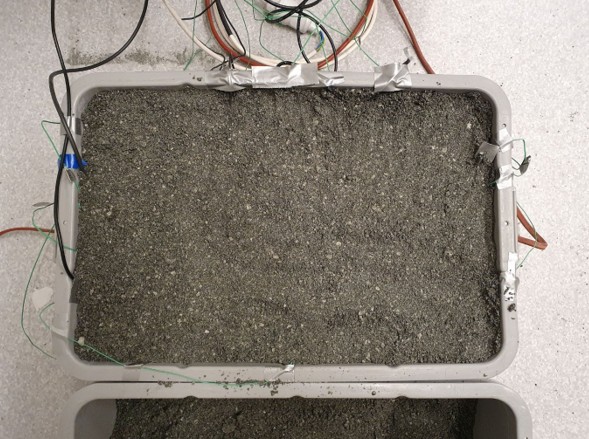 Prøving av sensorer i kabelsand. Når varmen fra strømkablene blir for stor tørker sanden ut og den blir til en “termos”. Man må derfor ha kontroll på uttørking og tilsig av fuktighet. Forskningsutfordringen vil være å utvikle enkle testmetoder og enkelt utstyr som gir tilstrekkelig nøyaktighet for formålet. Foto: SINTEF