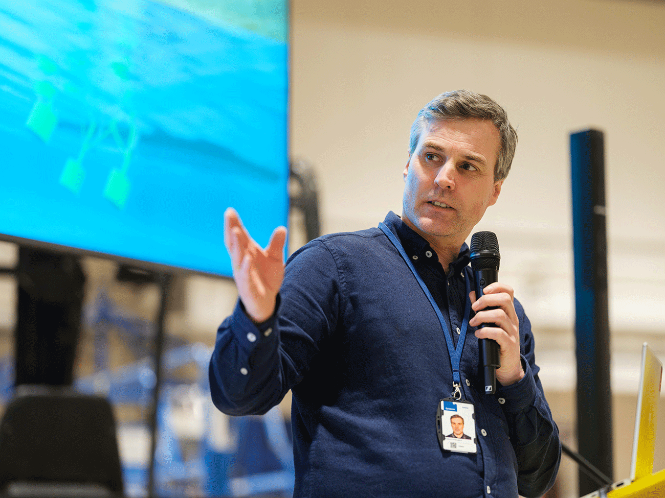 Prosjektleder for WindRise, Gudmund Olsen i Aker Solutions, fulgte testene i bassenget og forteller om hva de ønsker å oppnå.