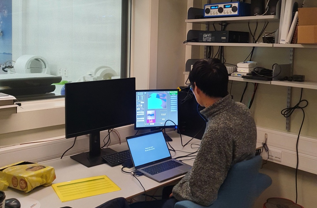 Deltakerne i studien skulle fylle ut en rekke selvrapporteringsskjemaer, inkludert angst, depresjon og opplevd stress, samt å gjennomføre databaserte oppgaver. Selve hjernescanningen ble gjort i 7T MR-maskinen ved St. Olavs hospital. Her ser vi stipendiat og førsteforfatter Shuer Ye under forsøkene. Foto: Maryam Ziaei
